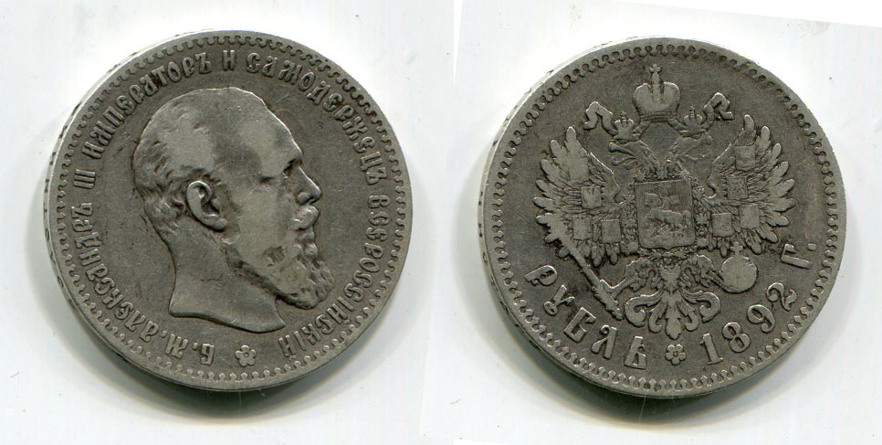 Монета серебро 1 рубль 1892 год Император Всероссийский Александр III