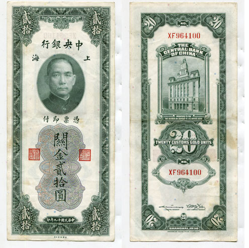 Денежный знак 20 золотых таможенных единиц. Центральный банк Китай 1930 год