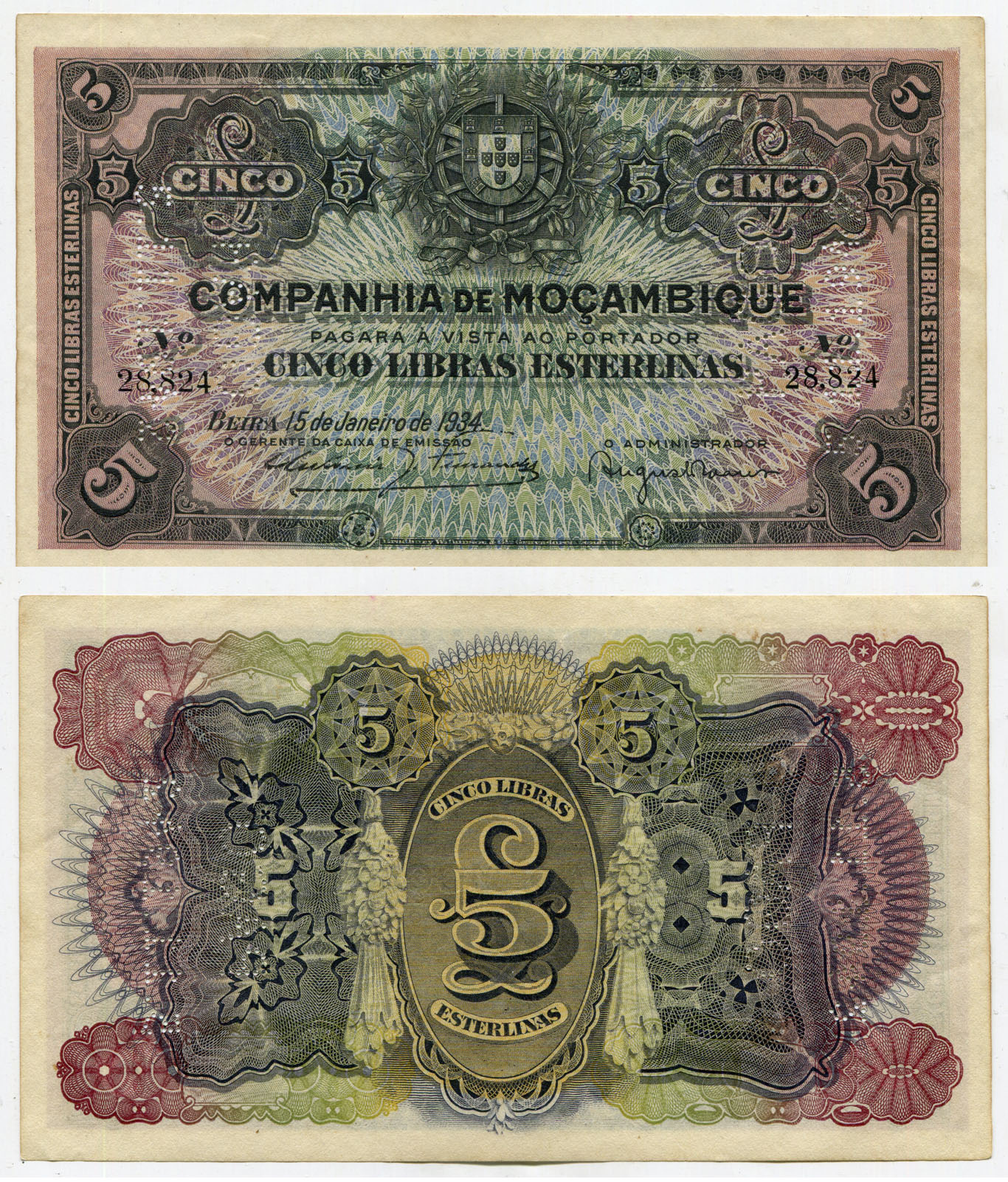 Денежный знак 5 свободных эстерлин Мозамбик, Бейра 1934 год